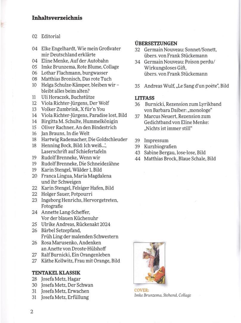 Das Literaturmagazin "Tentakel" wird seit 2008 herausgegeben und veröffentlicht Literatur und übersetzte Literatur, die in Osrwestfalen entstanden ist, sowie Werke der bildenden Kunst aus Ostwestfalen. Das Magazin erscheint dreimal im Jahr (Januar, Mai, September), kostet 3,50 € und kann abonniert werden unter redaktion_tentakel@yahoo.de, oder indem Sie 16,-€ auf das Kto IBAN DE35480501610070669684 (Matthias Bronisch) bei der Sparkasse Bielefeld überweisen, bitte immer mit Ihrer Adresse!